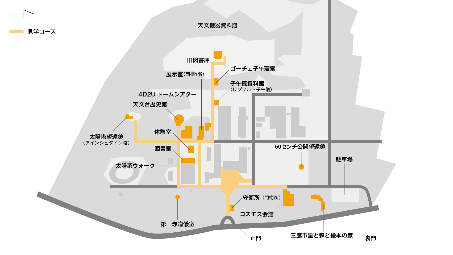三鷹キャンパス 公開施設 見学エリア キャンパスマップ(カラー) キャンパスマップ(モノクロ) 公開施設 第一赤道儀室 登録有形文化財 音声ガイド 手話ガイド 太陽系ウォーク 音声ガイド 手話ガイド 天文台歴史館 登録有形文化財 音声ガイド 手話ガイド 太陽塔望遠鏡 登録有形文化財 音声ガイド 見学は外観のみ 展示室 音声ガイド 手話ガイド 旧図書庫 登録有形文化財 音声ガイド 見学は外観のみ 子午儀資料館 重要文化財 登録有形文化財 音声ガイド ゴーチェ子午環室 登録有形文化財 音声ガイド 6mミリ波電波望遠鏡 第2回(2019年度)日本天文遺産 音声ガイド 天文機器資料館 音声ガイド 50センチ公開望遠鏡 音声ガイド 定例公開/要申し込み 4D2Uドームシアター 定例公開/要申し込み 休憩室 図書室 食堂・売店 2025年8月8日閉店 三鷹キャンパスのグラウンド利用(予約制・有料) 三鷹キャンパスのグラウンドは一般の方もご利用いただけます(予約制・有料)。くわしくは、国立天文台三鷹キャンパス 運動場使用申込 をご覧ください。