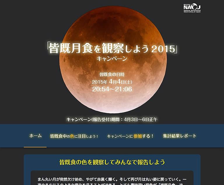 国立天文台では、この皆既月食を多くの方に見ていただくために、「皆既月食を観察しよう 2015」キャンペーンをおこないます。キャンペーンについての詳しい情報は、キャンペーンサイトをご覧ください。