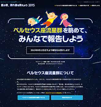 国立天文台では、ペルセウス座流星群を多くの方に見ていただくために、「夏の夜、流れ星を数えよう 2015」キャンペーンをおこないます。キャンペーンについての詳しい情報は、キャンペーンサイトをご覧ください。