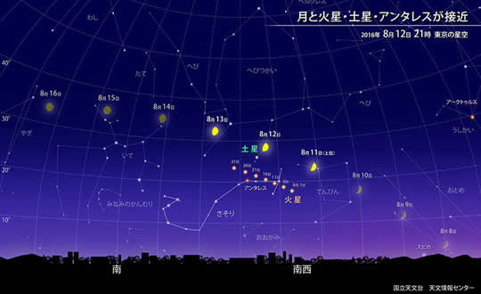 ほしぞら情報 2016年 2016年 2016年の展望と年間カレンダー 1月 東京の星空・カレンダー・惑星 初日の出情報 しぶんぎ座流星群 月が木星・火星・金星・土星に接近 日の出前の空で金星と土星が接近 2月 東京の星空・カレンダー・惑星 カノープスを見つけよう 月が金星と水星に接近 月が木星に接近 3月 東京の星空・カレンダー・惑星 木星が観望の好機 2016年3月9日 日本全国で部分食 月が火星・土星・アンタレスに接近 4月 東京の星空・カレンダー・惑星 水星が東方最大離角 月が木星に接近 今年最小の満月 5月 東京の星空・カレンダー・惑星 月が木星に接近 月が火星・土星に接近 火星が地球に最接近 6月 東京の星空・カレンダー・惑星 月が木星に接近 月が火星、土星に接近 7月 東京の星空・カレンダー・惑星 月が木星に接近 月が火星、土星に接近 8月 東京の星空・カレンダー・惑星 スター・ウィーク 伝統的七夕 ペルセウス座流星群が極大 火星・土星・アンタレスが接近 9月 東京の星空・カレンダー・惑星 金環日食(日本では見られない) 中秋の名月 日の出前に水星が見頃 10月 東京の星空・カレンダー・惑星 月が金星・土星・火星に接近 月が木星に接近 金星と土星が接近 11月 東京の星空・カレンダー・惑星 月が金星・土星に接近 今年最大の満月 アルデバラン食 12月 東京の星空・カレンダー・惑星 月が金星・火星に接近 ふたご座流星群が極大 月が木星に接近