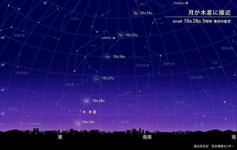 10月28日には、その木星にたいへん細い月が近づきます。この日、月は木星の少し上に位置しています。空がまだ明るくなり始める前の、日の出から1時間半ほど前に観察を始めていると、十分暗い空で、月と木星の輝きを楽しむことができるでしょう。