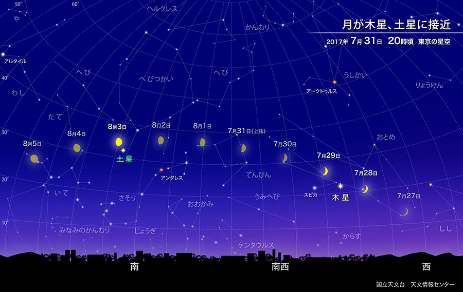 7月28日から29日にかけて月はふたたび木星のそばを通り、その後8月3日には土星に接近します。宵空に輝く木星、土星の共演と、そのそばを移動する月を観察してみてはいかがでしょう。