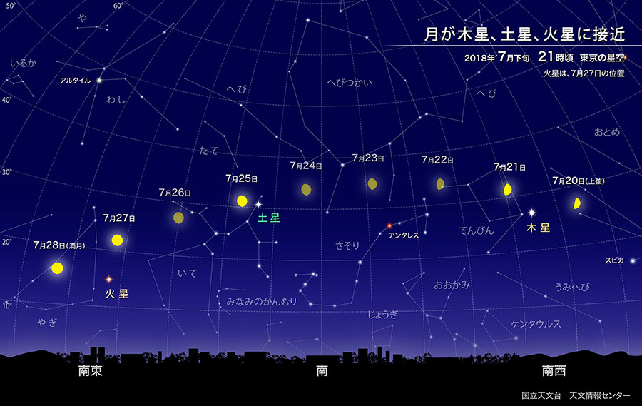 7月の下旬、南東から南西にかけての宵空は、夏の星座たちと、その間で輝く三つの惑星でとてもにぎやかです。最も明るいのが南東の空低いところにある火星で、7月31日の地球への最接近を(注1)目前に控えて、マイナス2.7等から2.8等というひときわ強い輝きを放っています。次に明るいのが南西の空にある木星で、こちらもマイナス2等を超える明るさで、おおいに目立っています。それに比べれば、控えめに輝いているのは三つの惑星の真ん中、南の空の土星です。とはいえ、約0等ですからたやすく見つけることができるでしょう。