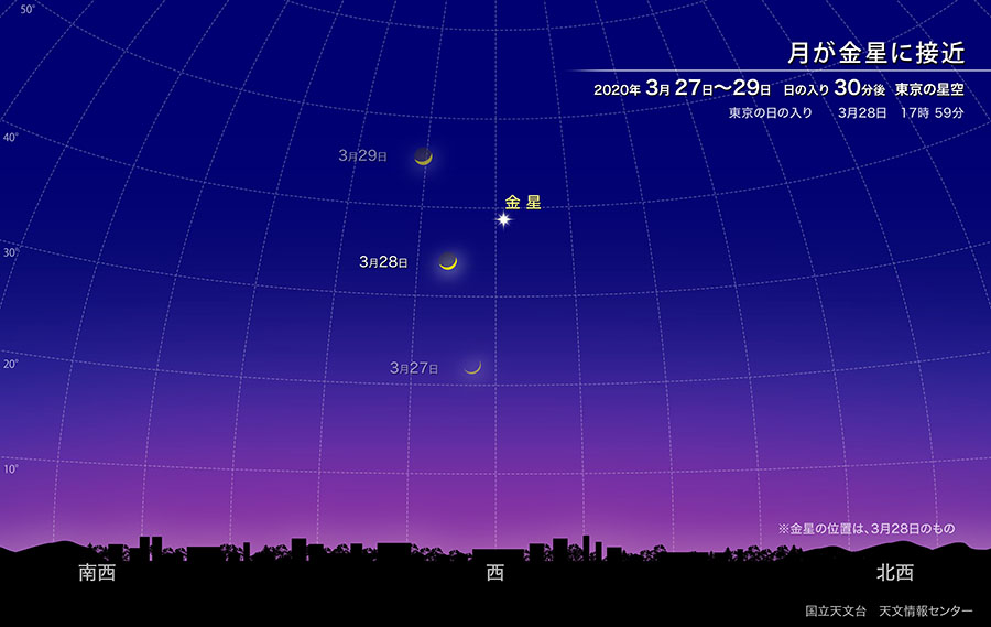 3月下旬、太陽が沈んだばかりの西の空では、金星がひときわ鋭い光を放っています。3月25日に東方最大離角を迎える金星は、この時期、たいへん見やすくなっています。
