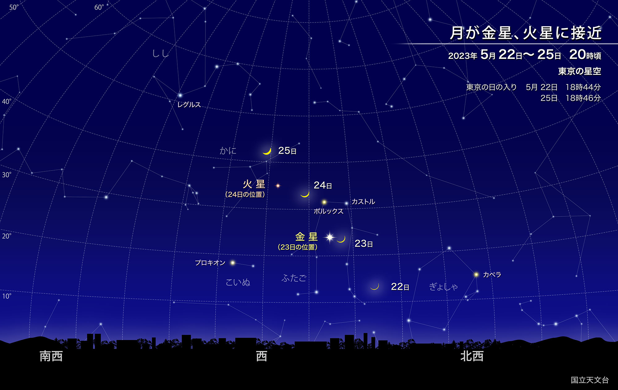 5月23日から25日にかけて、金星と火星の近くに細い月が見えます。月と金星は、まだ夕焼けの残るほの明るい空の中でも観察することができます。火星は日の入りから1時間ほど時間がたち、空が十分暗くなってから観察すると良いでしょう。少しずつ太くなりながら東へ移動していく月と、惑星たちの共演を楽しみましょう。