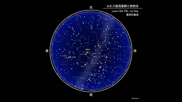 流星数が多い三大流星群のうち、8月のペルセウス座流星群と12月のふたご座流星群は、月明かりの影響のない良い条件で見られるでしょう。特にふたご座流星群は極大時刻も日本の深夜に重なり、絶好の条件です。