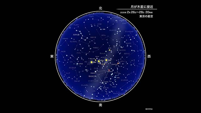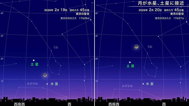 2月19日から20日にかけて、日の入り後の西の空で月が水星、土星に相次いで接近します。太陽に近く、観察可能な時でも低い空にあるため見づらい水星ですが、2月下旬のこの頃は、ちょうど夕方の西の空で見頃を迎えています。2月19日には、水星のすぐ上に月齢2のいわゆる三日月が見られます。細い月なので必ずしも見やすくはありませんが、夕焼けの残る空に見つけることができると、その下に位置する水星を探すための良い目印になりそうです。