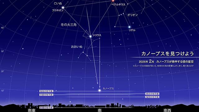 また水星よりも高い位置で、やや南より(左より)の空には、土星が見られます。19日には月の方が低い空に見えますが、翌日の20日には月が土星よりも高い位置に移動します。月と土星の位置関係が変わる様子も、合わせてお楽しみください。