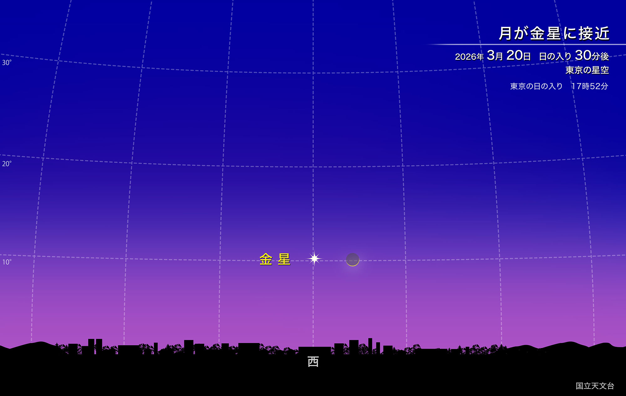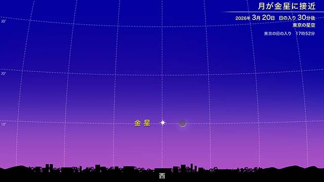 3月20日、春分の日の日の入り後に、月齢1.3の月が金星に接近しています。月も金星も高度が低く、その上、月がたいへん細いため、接近の様子を見るには場所や時刻に注意する必要があります。