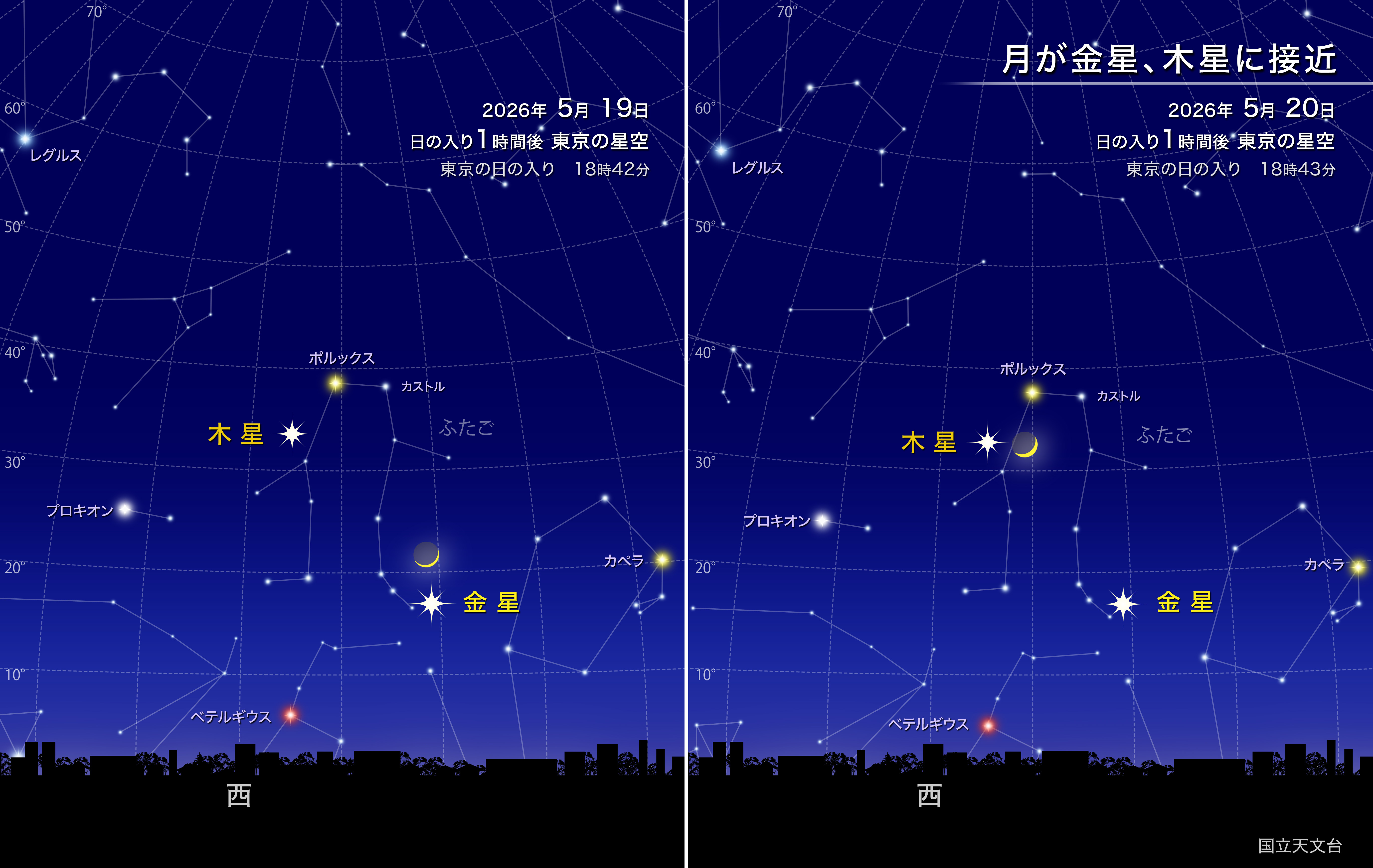 5月の日の入り後、西の空の高い位置には木星が、低い位置には宵の明星とも呼ばれる金星が見えます。