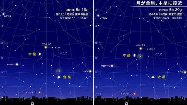 20日には、前日の三日月よりも少しだけ太くなった月が木星に接近します。マイナス1.9等の明るさで輝く木星と細い月が並ぶ様子は見栄えのすることでしょう。