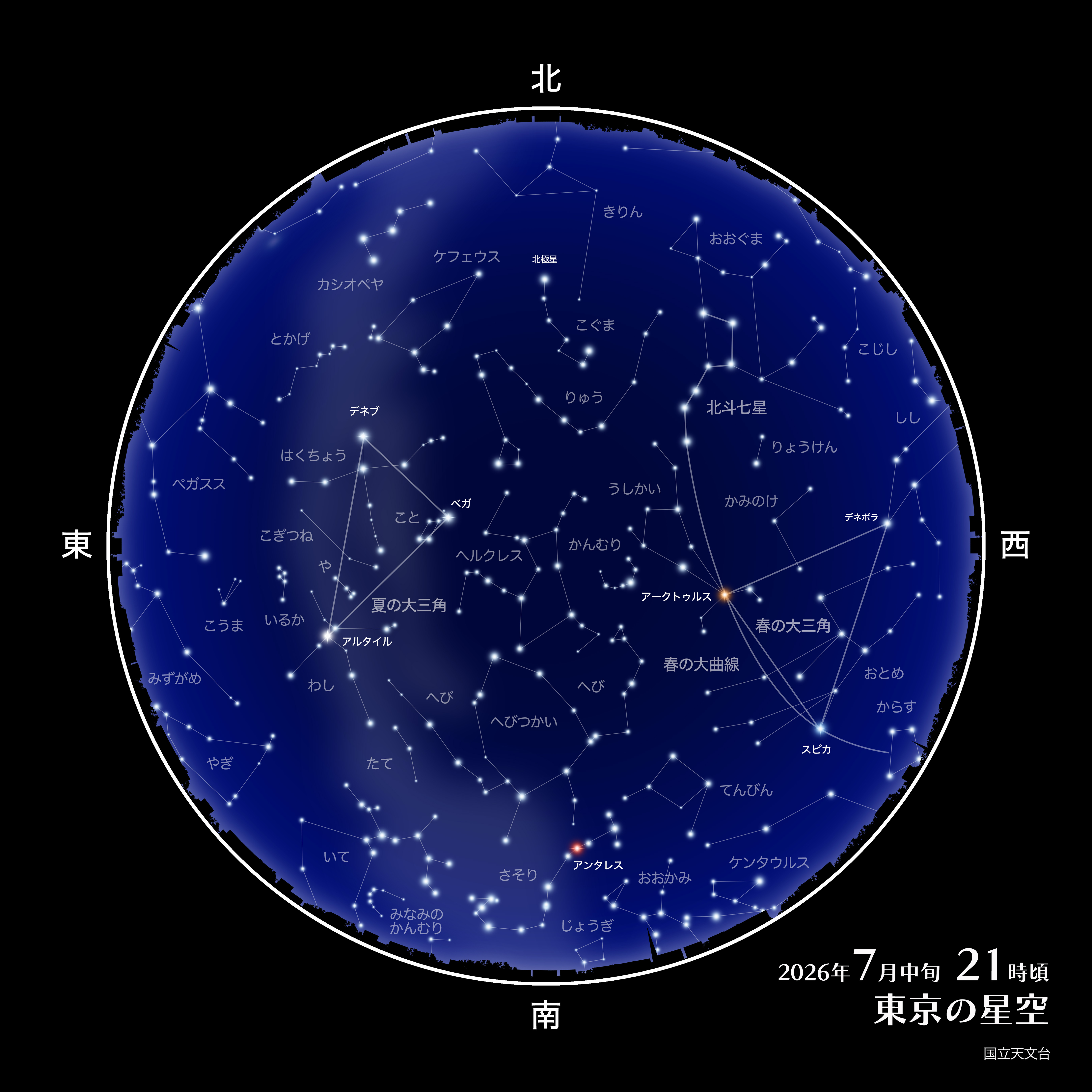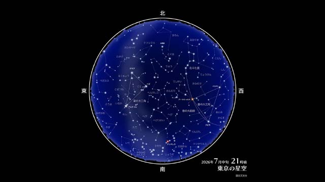 | 31日 | このころ、みずがめ座δ(デルタ)南流星群が極大(見頃は極大を中心とした数日間の深夜から未明。1時間に2~3個程度。月が明るく条件は悪い) |