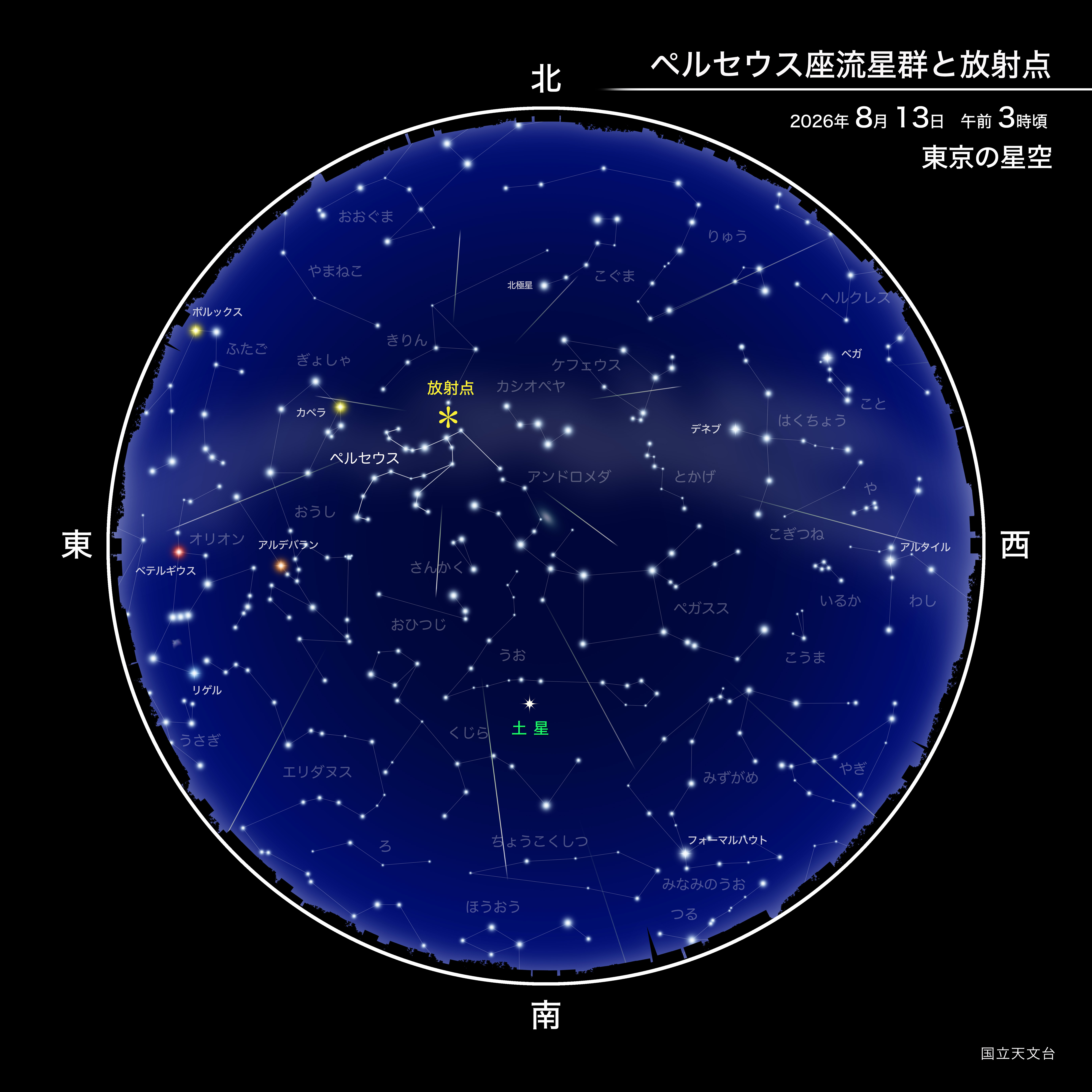 三大流星群の一つであるペルセウス座流星群が見頃を迎えます。2026年のペルセウス座流星群の活動(注1)は、8月13日11時頃に極大(注2)となることが予想されています。日本では昼間にあたり、この時間帯に観察することはできませんが、その直前となる13日未明を中心に多くの流星が見られそうです。また極大の8月13日が新月で、月明かりの影響を全く受けることがないという好条件ですので、ぜひ観察してみましょう。