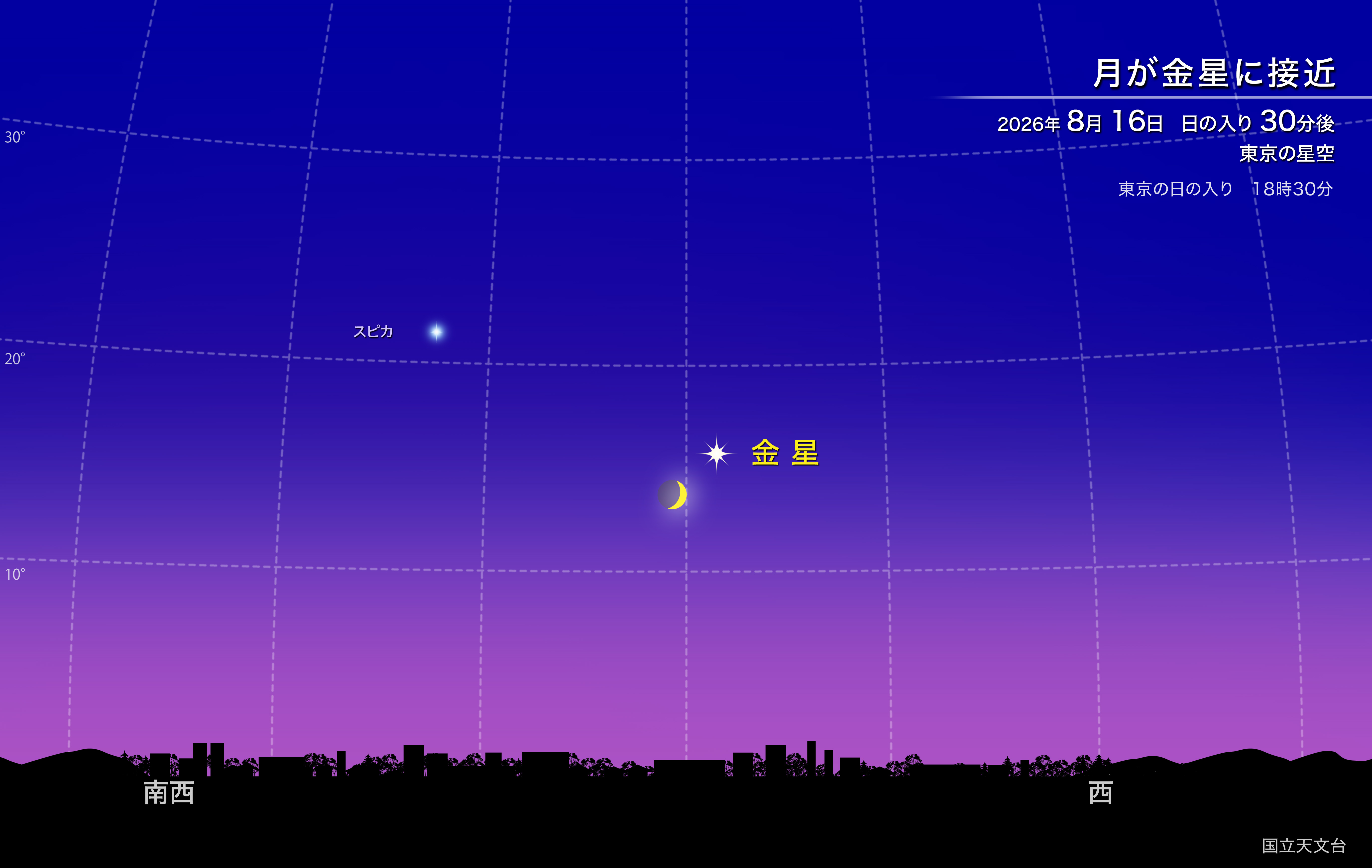 8月16日、月齢3.4の細い月が、西の空で金星と近づきます。金星は、この前日の15日に地球から見て、見かけの位置が太陽から最も離れる、東方最大離角となり、西の空で非常に明るく輝いています。まだ明るさの残る空でも見つけることができますので、細い月と金星のランデブーを楽しんでみましょう。