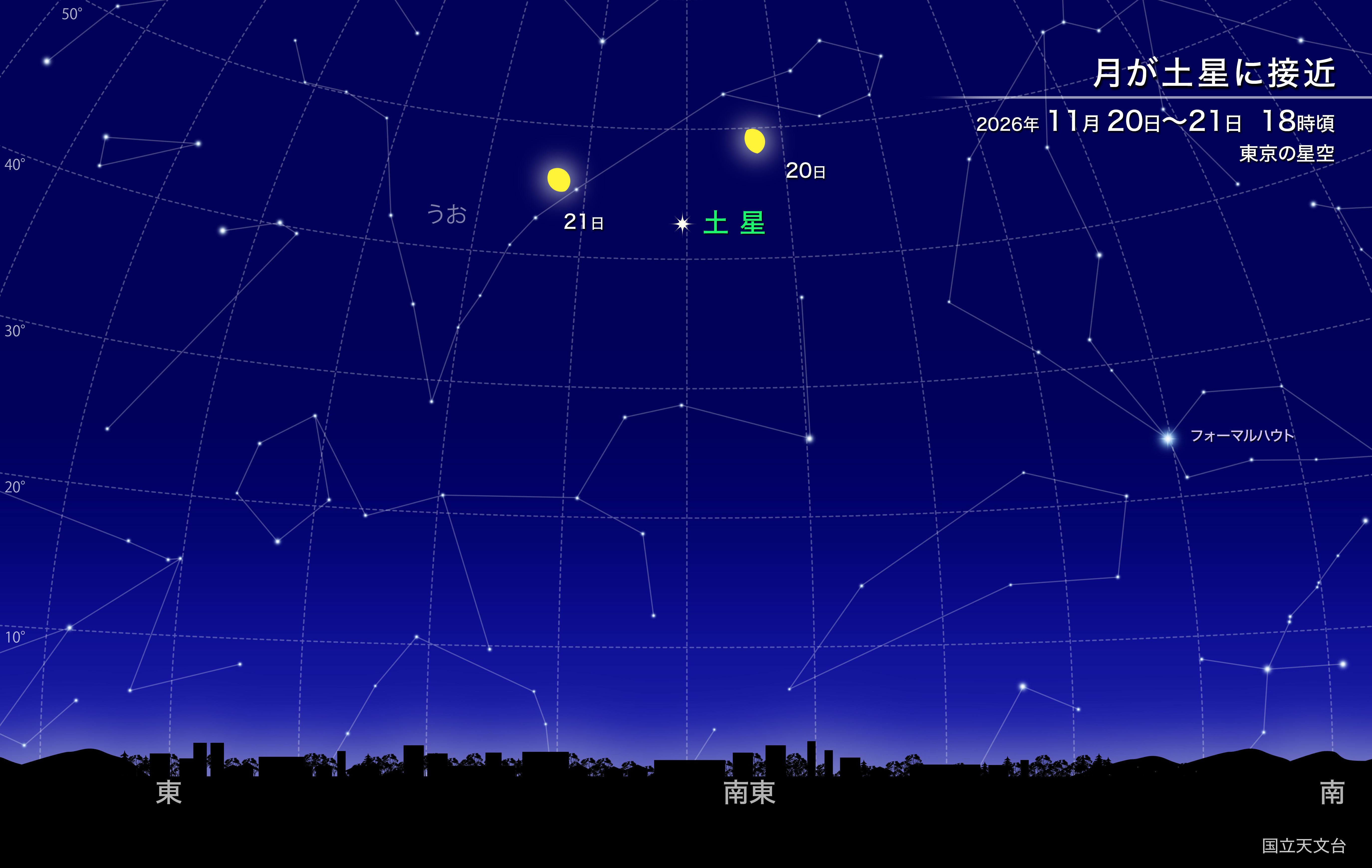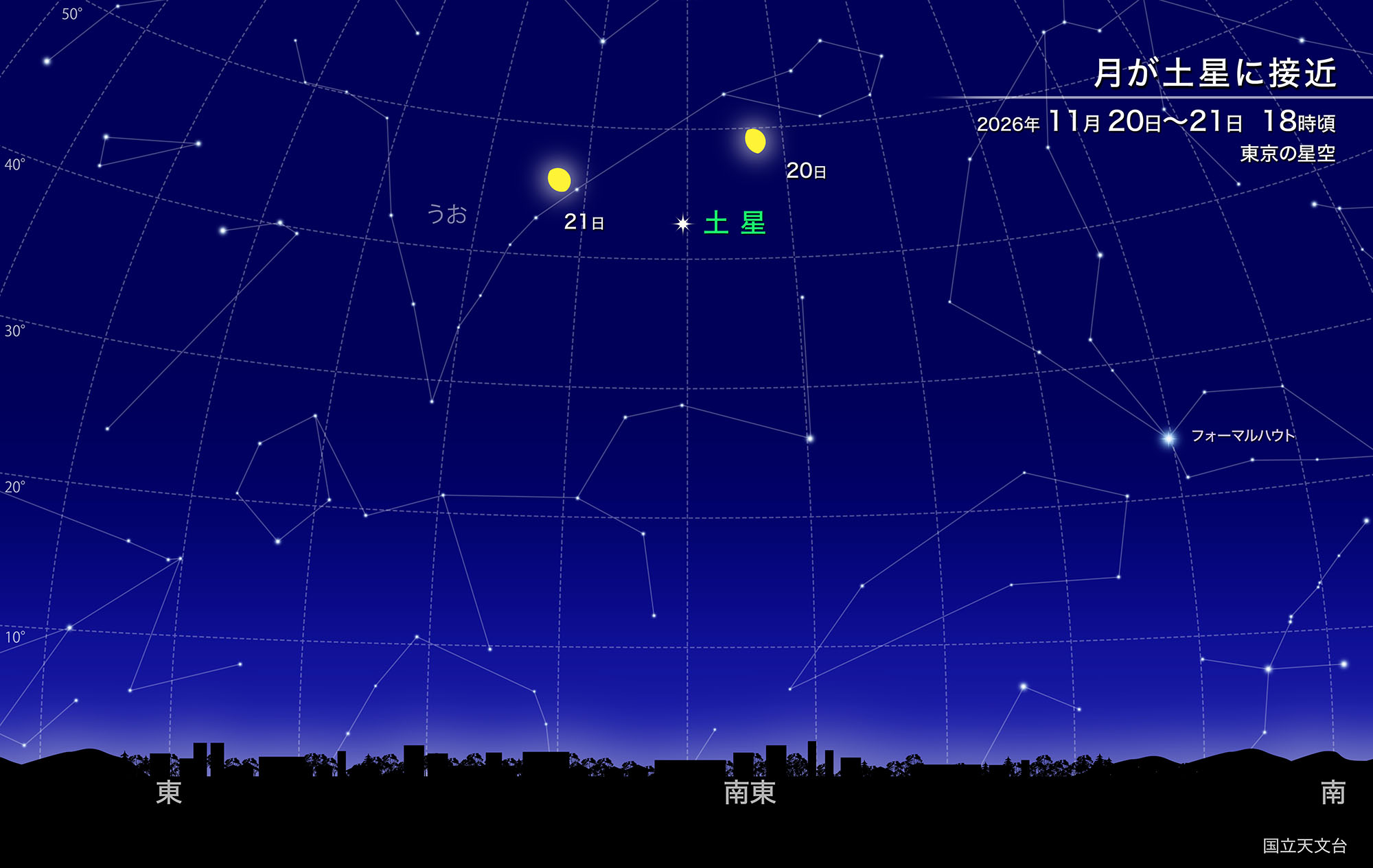 11月は、日の入り後の南東の空に、土星が見えています。土星の明るさは1等ほどですが、明るい星の少ない秋の星座の領域にあり、見つけやすいでしょう。20日と21日には、24日に満月となる明るい月が土星の近くに見えます。土星が見えづらい場合は、月を手で隠すなどして土星を探してみてください。