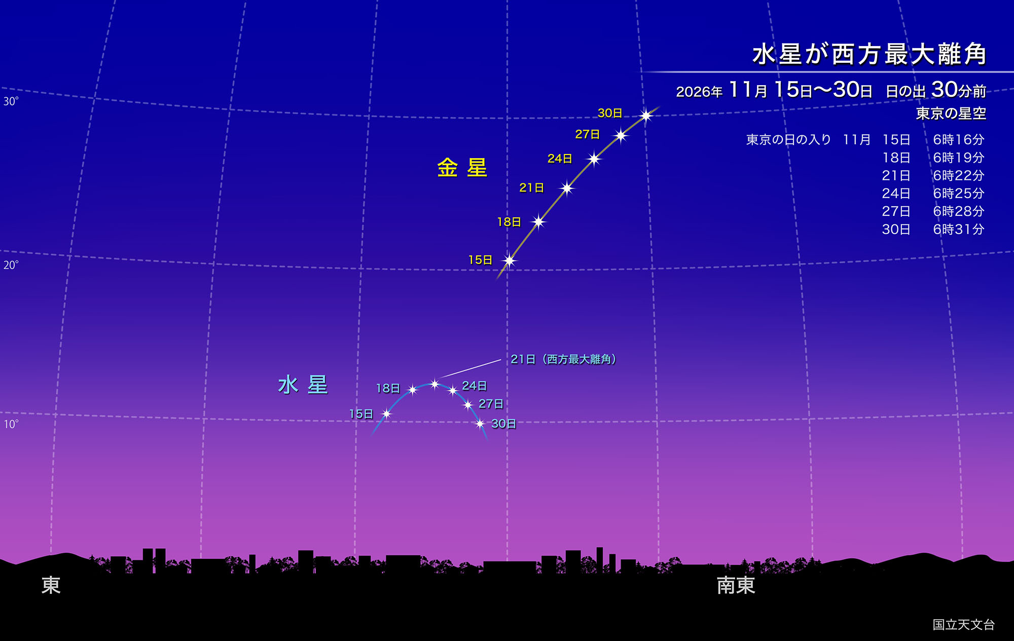 11月21日に水星は西方最大離角を迎えます。東京では15日から29日の間、日の出30分前の水星の高度が10度を超え、見つけやすくなります。水星よりも少し空の高い位置には金星があります。30日にマイナス4.9等の最大光度となる金星(「月が金星に接近」を参照)は、水星を探すときの目印になるでしょう。夜明け前の薄明の中で水星を探すことは簡単ではありませんが、双眼鏡を使うと見つけやすくなるでしょう。双眼鏡を使う際は、太陽を双眼鏡で見ることのないよう、日の出の前には観察を終えるようにしてください。