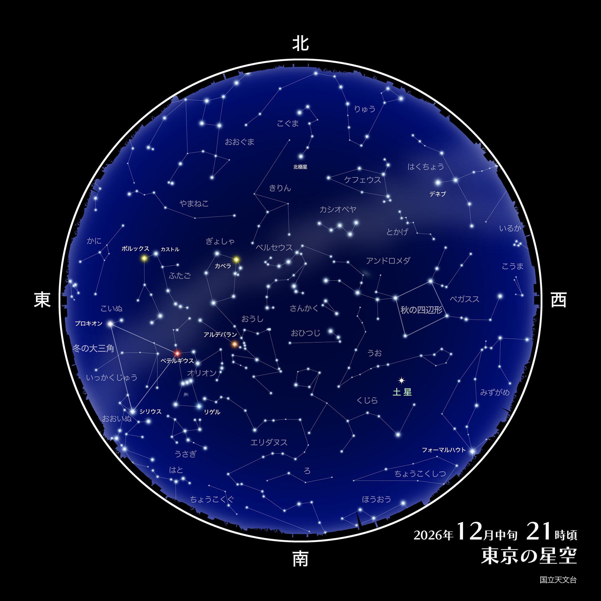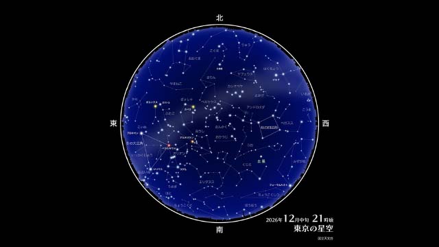 | 14日 | 23時頃、ふたご座流星群が極大(見頃は14日深夜から15日未明。1時間に60個程度。月明かりがなく、極大時刻も良いため、絶好の条件) |