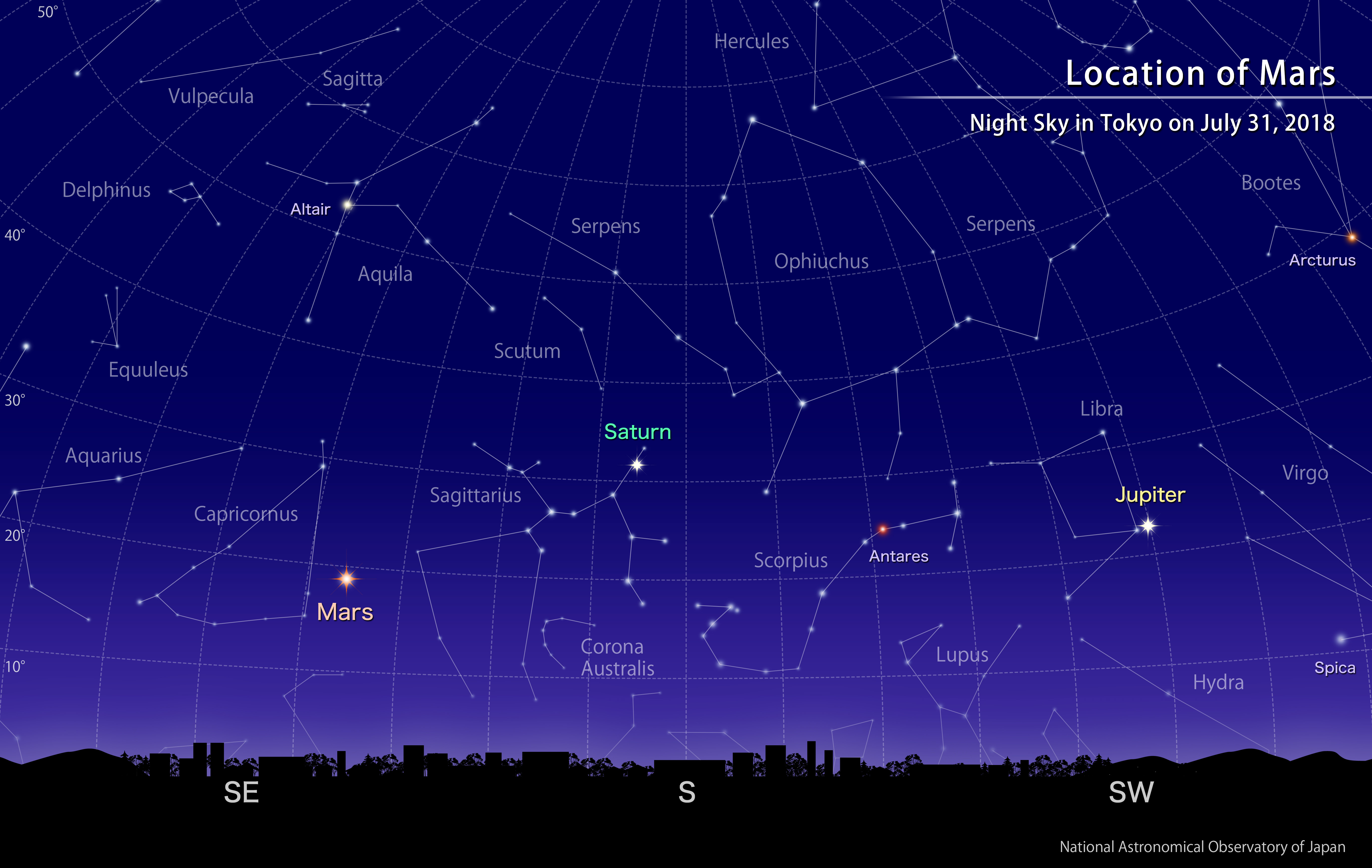 On July 31, Mars is located in the constellation Capricornus. Seen from Tokyo, Mars rises in the southeastern sky around 7 p.m. and reaches culmination around midnight. Its brightness is -2.8 magnitude. Also, the Moon rises in the eastern sky around 9:00 p.m. The bright red Mars shines against the moonlight and its reddish color and brightness stand out in the night sky.