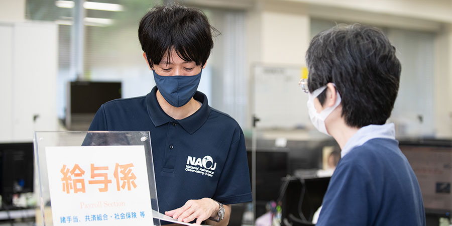 The NAOJ Administration Department consists of five groups: General Affairs, Financial Affairs, Accounting, Facilities, and Research Promotion. In addition to the headquarters here in Mitaka, NAOJ has branches in Mizusawa (Iwate Prefecture), Nobeyama (Nagano Prefecture), Hawaiʻi, and Chile. Department members are transferred between the five groups at the five locations every two to four years. I was first assigned to the Procurement Unit under the Accounting Group, where I worked in contracting for four years. Then I was transferred to the General Affairs Group to work in human resources. I’m still in the same group but in another unit, the Payroll Unit, and manage payroll and taxes for employees. We are busy and often work overtime during the year-end and the period around the change of the fiscal year, when tax adjustments are made. By contrast, the period from June to August is not that busy, but then the year’s end comes with a hint of fall in the air.