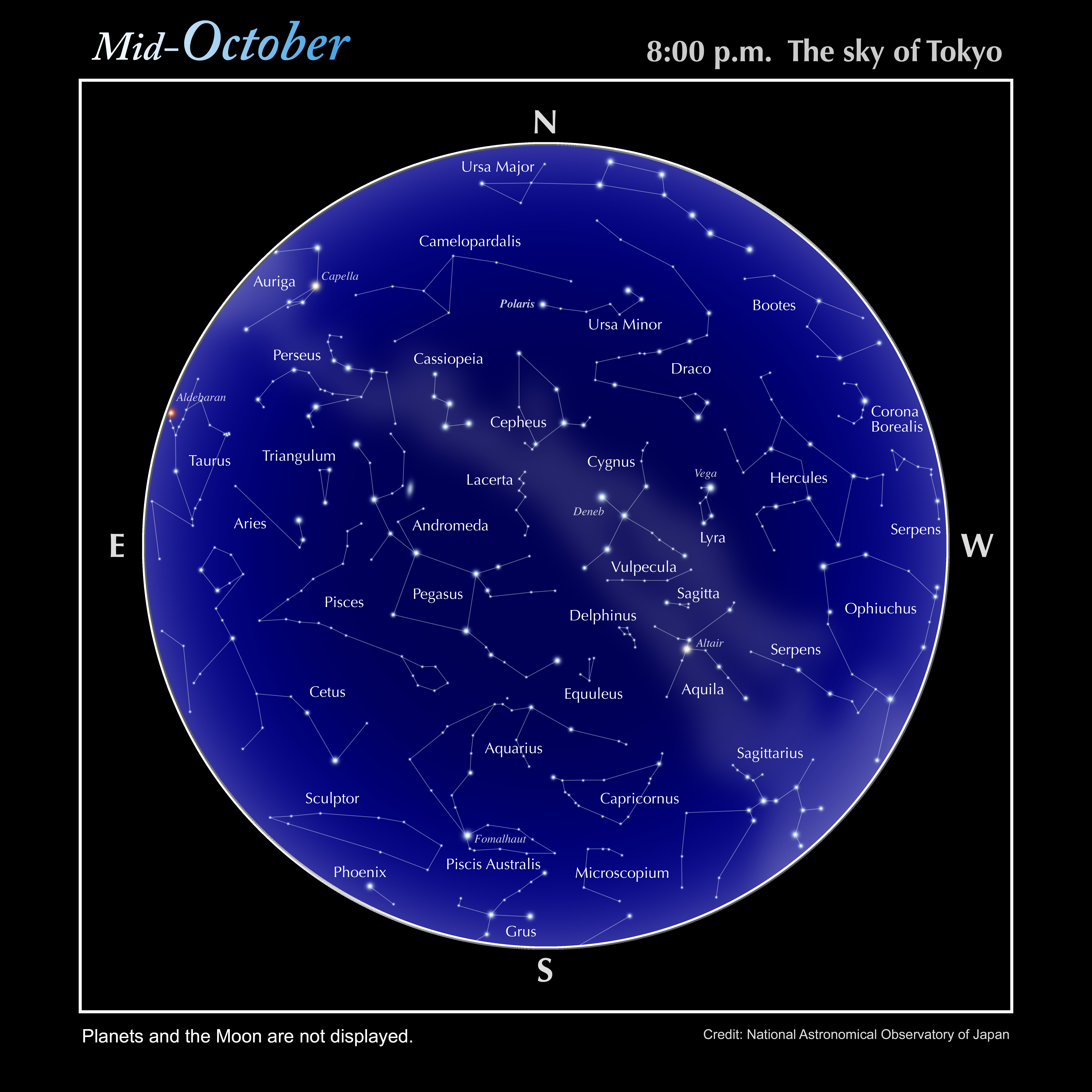 - In case of trimming the images, please write clearly the credit (NAOJ) and caption (Ex: Starry sky of Tokyo at 8 p.m. in mid of August) near the image.
