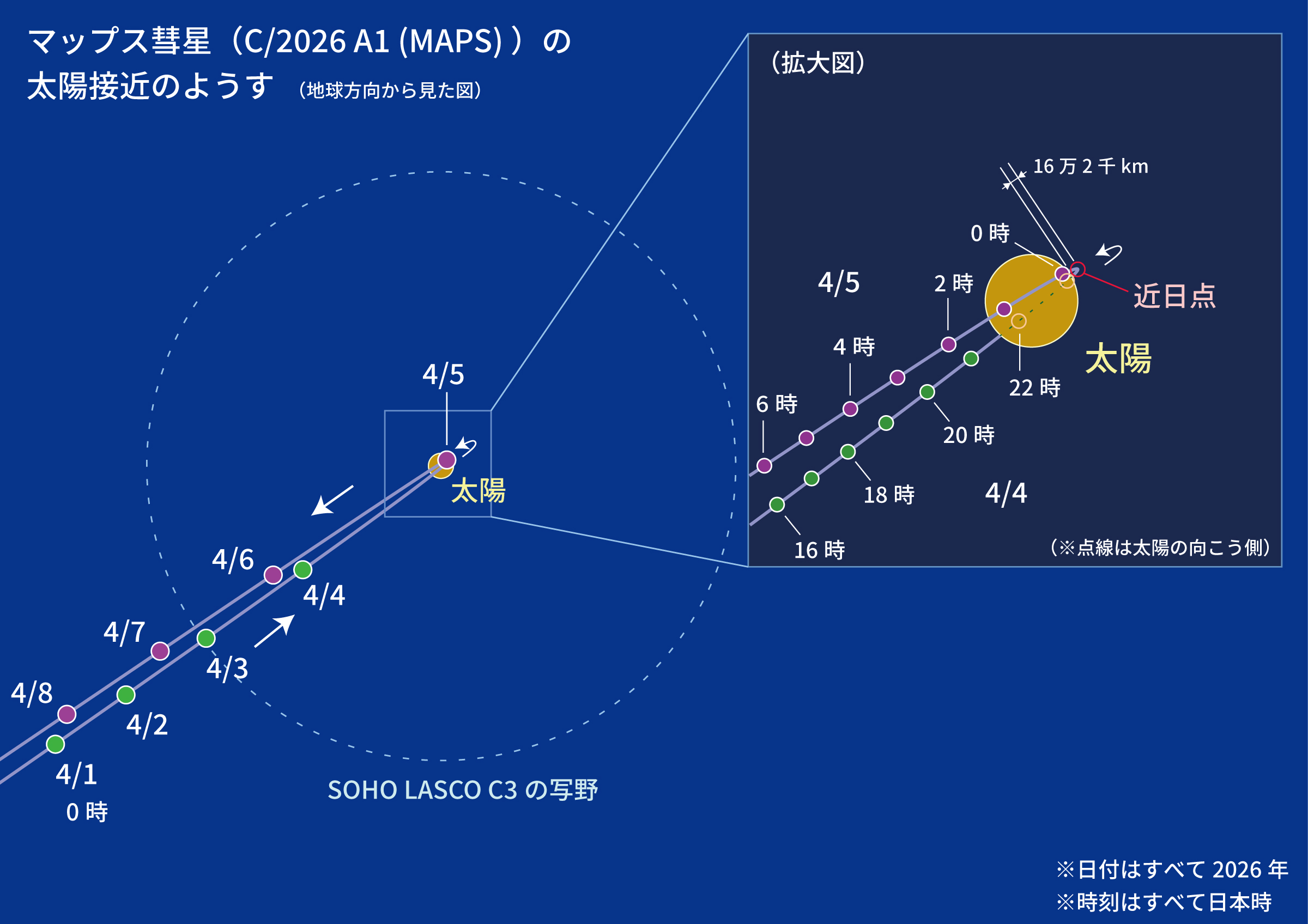 C/2026 A1(MAPS)(以下、このページでは「マップス彗星」と表記)は、2026年1月13日にチリのアマチュア天文家たちが運営するMAPSサーベイによって発見された新彗星です。その後の観測によって軌道が確定し、この彗星が、太陽に非常に近づく彗星の一グループ、「クロイツ群」に属していることが判明しました。クロイツ群は、過去に大彗星が太陽に接近したときに分裂し、その破片が再び太陽に接近してきた彗星群だと考えられています。その特徴の一つは太陽との接近距離です。マップス彗星は、2026年4月4日23時頃(日本時)に太陽と最接近しますが(近日点通過)、その時の太陽中心との距離(近日点距離)は85万8千キロメートル(0.00573 au (注1))です。太陽の半径を差し引くと、太陽表面からの距離はわずかに16万2千キロメートルとなります。これは、地球から月までの距離の半分以下に相当します。まさに太陽をかすめる彗星なのです。